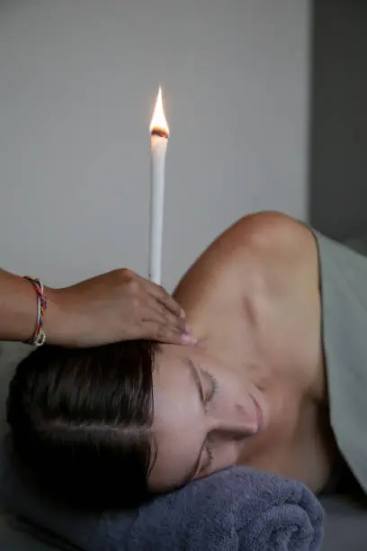 Während der Sitzung liegen Sie bequem auf der Seite, während der Therapeut eine spezielle, hohle Kerze aus natürlichem Bienenwachs sanft in den äußeren Gehörgang platziert. Das sanfte Abbrennen der Kerze erzeugt einen leichten Unterdruck und eine angenehme Wärme, die Sie zusammen mit dem leisen Knistern der Flamme in einen Zustand meditativer Entspannung versetzt.